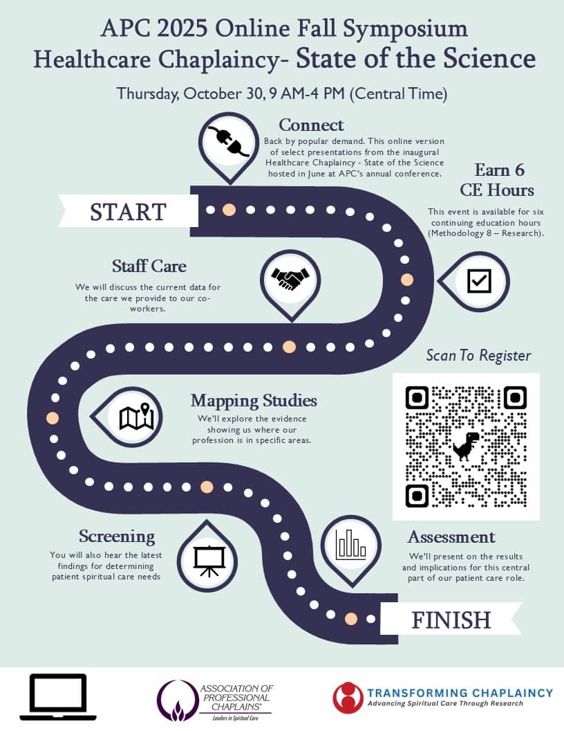 We're doing it again! The Healthcare Chaplaincy - State of the Science will be offered once more (just in a slightly condensed version from the in-person event, June 12, 2025) as the Association of Professional Chaplains Fall Online Symposium, Thursday, October 30, 9 AM - 4 PM (Central Time).